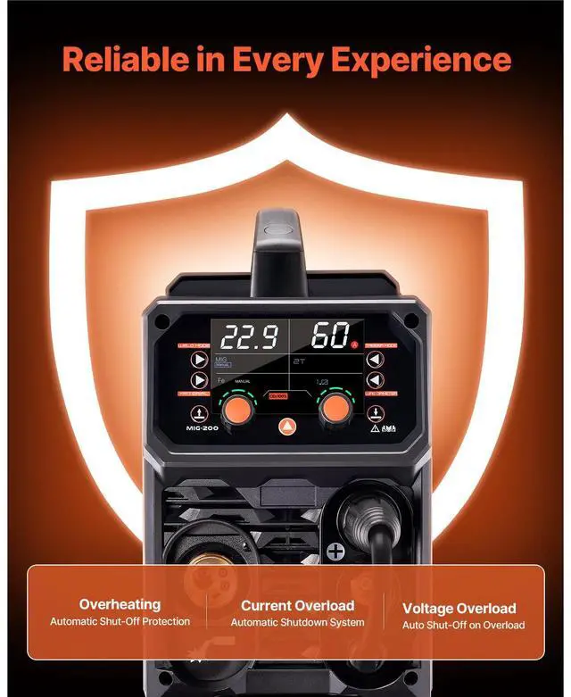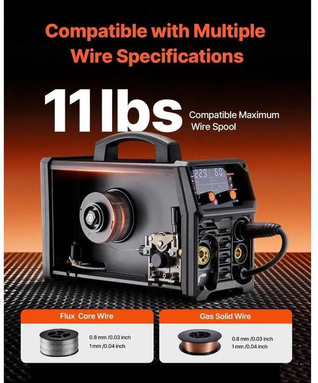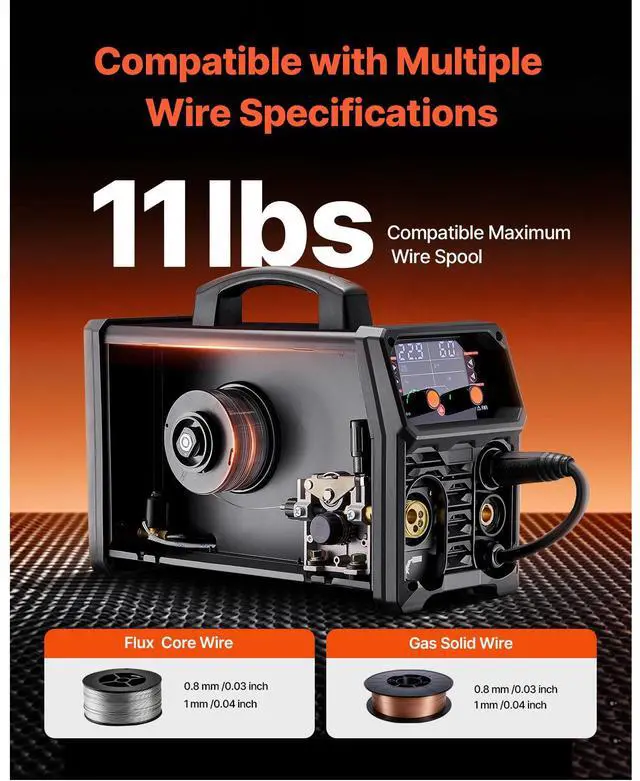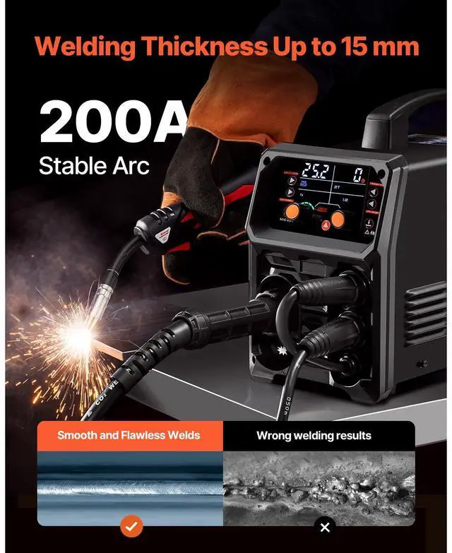 Welding Thickness: 0.59 inch ( 15 mm),Compatible Wire Type: Flux Core Wire / Gas Solid Wire,Compatible Maximum Wire Spool: 11 lbs / 5 kg,Output Current: 200A,Item Model Number: MIG-200,Product Weight: 27.3 lbs / 12.4 kg (Include All Accessories),Functions: Gasless MIG, Gas MIG, MMA, Lift TIG,Product Dimensions: 16.9 x 7.1 x 12.6 inch / 430 x 180 x 320 mm,Input Capacity: 6.1 KVA,Compatible Wire Diameter: 0.03 inch / 0.8 mm, 0.04 inch / 1 mm