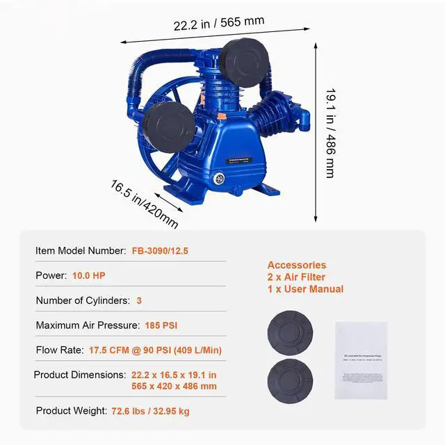 Flow Rate: 17.5 CFM @ 90 PSI (409 L/Min),Number of Cylinders: 3,Item Model Number: FB-3090/12.5,Product Weight: 72.6 lbs / 32.95 kg,Maximum Air Pressure: 185 PSI,Product Dimensions: 22.2 x 16.5 x 19.1 in / 565 x 420 x 486 mm,Power: 10.0 HP