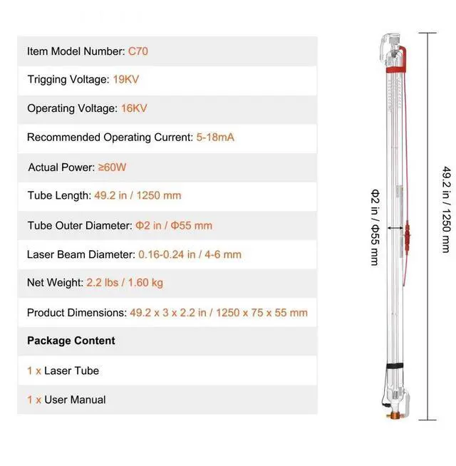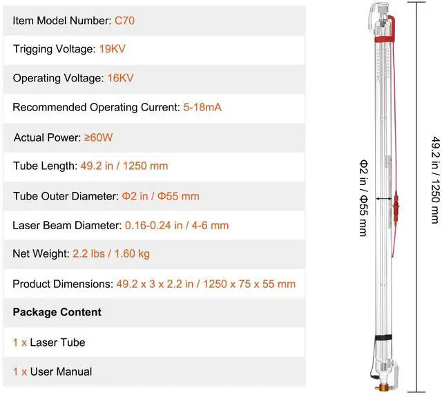 Actual Power: 60W,Operating Voltage: 16KV,Tube Outer Diameter: 2 in / 55 mm,Item Model Number: C70,Trigging Voltage: 19KV,Recommended Operating Current: 5-18mA,Laser Beam Diameter: 0.16-0.24 in / 4-6 mm,Product Dimensions: 49.2 x 3 x 2.2 in / 1250 x 75 x 55 mm,Tube Length: 49.2 in / 1250 mm,Net Weight: 2.2 lbs / 1.60 kg