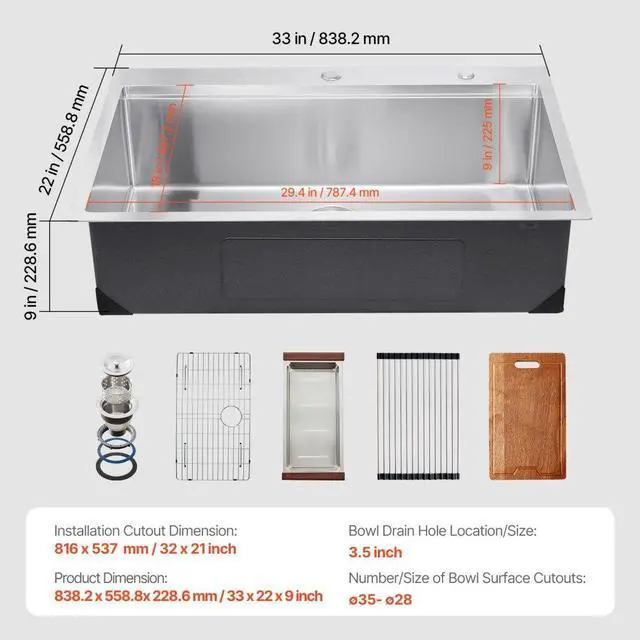 Bowl Drain Hole Location: Offset Hole,Product Dimension: 33x22x9 inch / 838.2x558.8x228.6 mm,Item Model Number: T332209RS1,Product Weight: 31.7 lbs / 14.4 kg,Installation Cutout Dimension: 32x21 inch / 816x537 mm