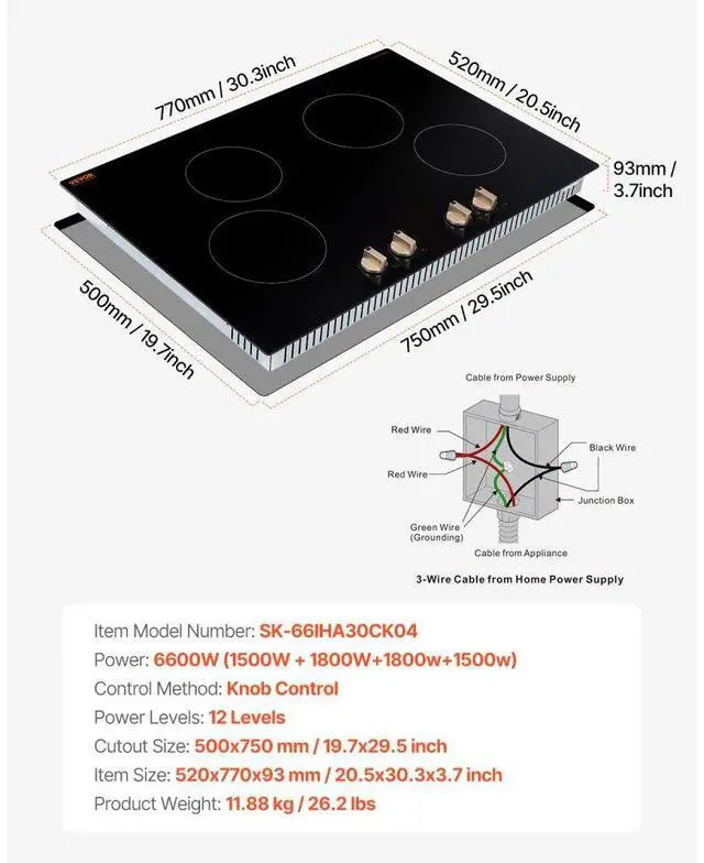 Cutout Size: 750x500 mm / 29.5x19.7 inch,Item Size: 770x520x93 mm / 30.3x20.5x3.7 inch,Control Method: Knob Control,Item Model Number: SK-66IHA30CK04,Product Weight: 11.88 kg / 26.2 lbs,Power: 6600W,Power Levels: 12 Levels