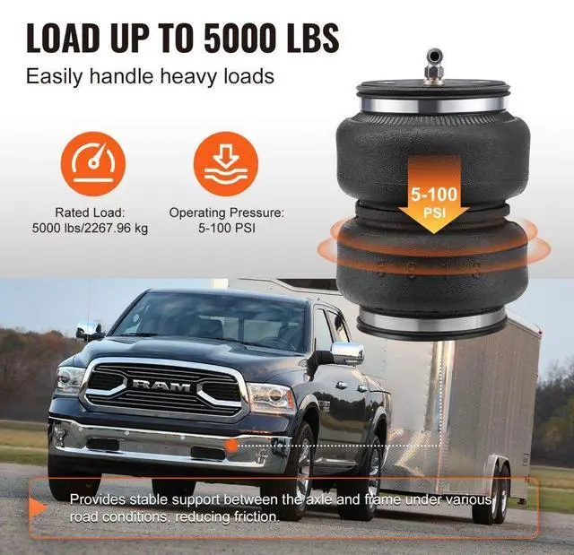 Operating Pressure: 5 - 100 psi,Suitable Axle: Rear Axle,Item Model Number: 7X 57365,Number of Airbags: 2,Product Weight: 23.2 lbs/10.54 kg, ± 3%,Compatible Vehicles: 2011-2018 Dodge Ram 1500, 2019-2021 Dodge Ram 1500 Classic,Air Tube Diameter: 1/4 inch,Product Dimensions: 5.6"x7.3"/141x185 mm,Inlet Port Thread: 1/8" NPTF on Air Bag Fitting,Main Material: Air Bag: NR, Iron Parts: Q355,Rated Load: 5000 lbs/2267.96 kg