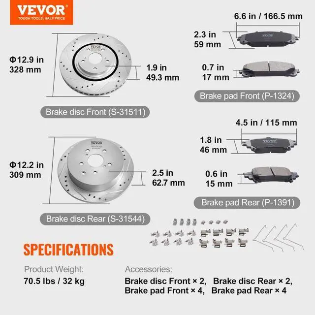 Compatible Vehicle Models: 2010-2015 Lexus RX350, 2010-2015 Lexus RX450H, 2014 Toyota Highlander (Excluding Hybrid Models), 2015-2019 Toyota Highlander, and 2011-2020 Toyota Sienna,Brake Rotor Size: 12.9×1.9 inch/328×49.3 mm (Front), 12.2×2.5 inch/309×62.7 mm (Rear),Item Model Number: HQP519/1907,Product Weight: 70.5 lbs/32 kg,Brake Pad Size: 6.6×2.3×0.7 inch/166.5×59×17 mm (Front), 4.5×1.8×0.6 inch/115×46×15 mm (Rear),Brake Pad Part Number: P-1324 (Front), P-1391 (Rear),Main Material: Brake Disc: Cast Iron (HT250), Brake Pad: Ceramic,Brake Rotor Part Number: S-31511 (Front), S-31544 (Rear)