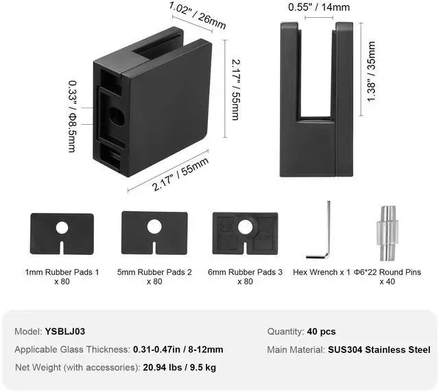Applicable Glass Thickness: 0.31-0.47in / 8-12mm,Net Weight (with accessories): 20.94 lbs / 9.5 kg,Model: YSBLJ03,Overal Dimensions (L x W x H): 2.17x2.17x1.02" / 55x55x26mm,Quantity: 40 pcs,Main Material: SUS304 Stainless Steel