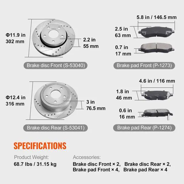 Compatible Vehicle Models: 2007-2017 Jeep Wrangler, 2018 Jeep Wrangler JK,Brake Rotor Size: 11.9×2.2 inch/302×55 mm (Front), 12.4×3.0 inch/316×76.5 mm (Rear),Item Model Number: 53040/53041,Product Weight: 68.7 lbs/31.15 kg,Brake Pad Size: 5.8×2.5×0.7 inch/146.5×63×17 mm (Front), 4.6×1.8×0.6 inch/116×46×16 mm (Rear),Brake Pad Part Number: P-1273 (Front), P-1274 (Rear),Main Material: Brake Disc: Cast Iron (HT250), Brake Pad: Ceramic,Brake Rotor Part Number: S-53040 (Front), S-53041 (Rear)