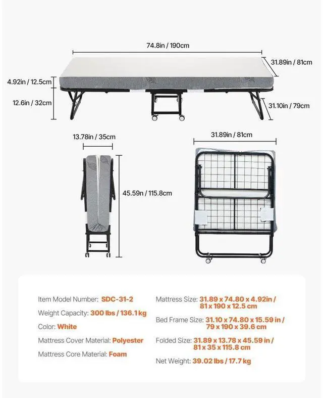 Weight Capacity: 300 lbs / 136.1 kg,Bed Frame Size: 31.10 x 74.80 x 15.59 in / 790 x 1900 x 396 mm,Color: White,Item Model Number: SDC-31-2,Folded Size: 31.89 x 13.78 x 45.59 in / 810 x 350 x 1158 mm,Mattress Cover Material: Polyester,Net Weight: 39.02 lbs / 17.7 kg,Mattress Core Material: Foam,Mattress Size: 31.89 x 74.80 x 4.92 in / 810 x 1900 x 125 mm