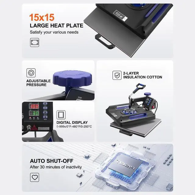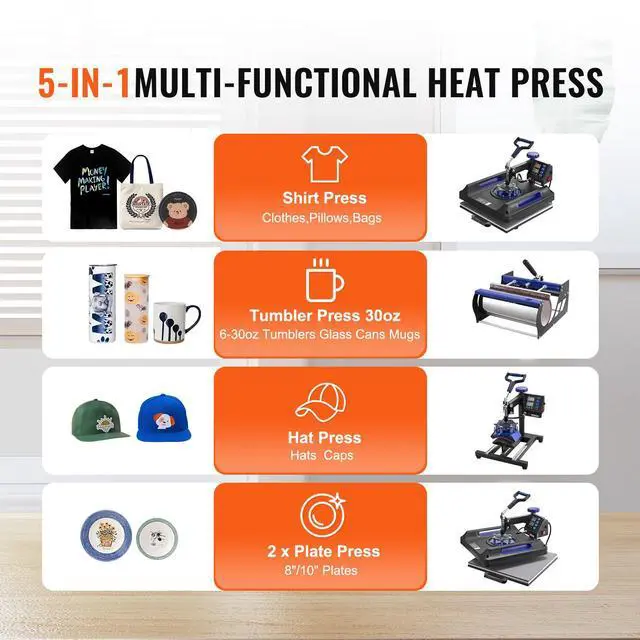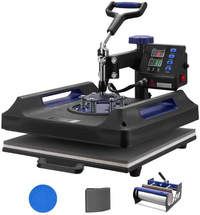 VEVOR 5 in 1 Heat Press Machine 15x15 in 30oz Tumbler Press T-Shirts Black+Blue