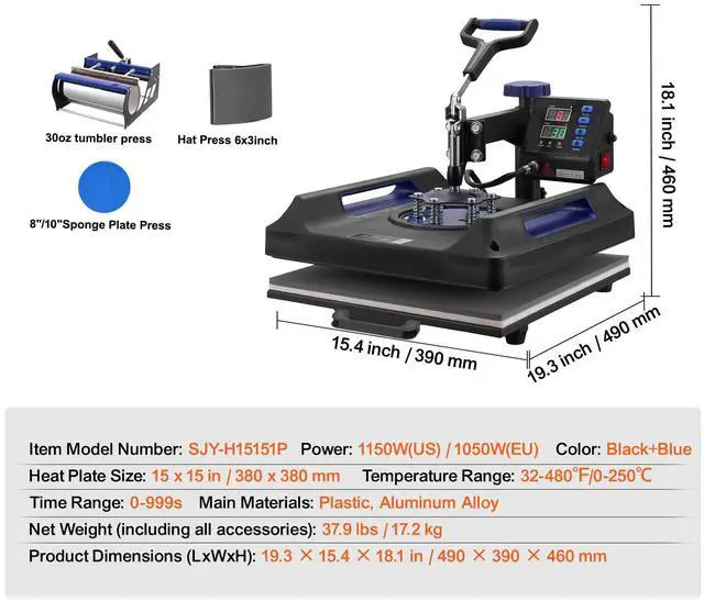 Heat Plate Size: 15 x 15 in / 380 x 380 mm,Main Materials: Plastic, Aluminum Alloy,Net Weight (including all accessories): 37.9 lbs / 17.2 kg,Time Range: 0-999s,Color: Black+Blue,Item Model Number: SJY-H15151P,Temperature Range: 32-480/0-250,Power: 1150W(US) / 1050W(EU)