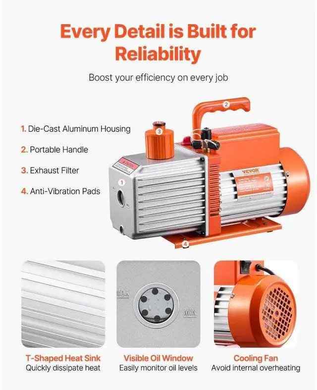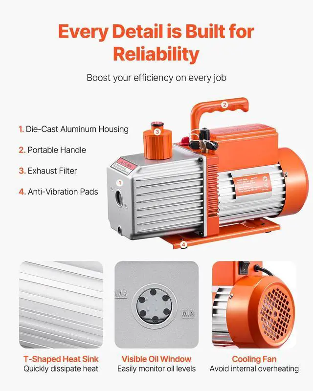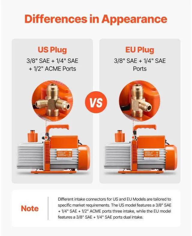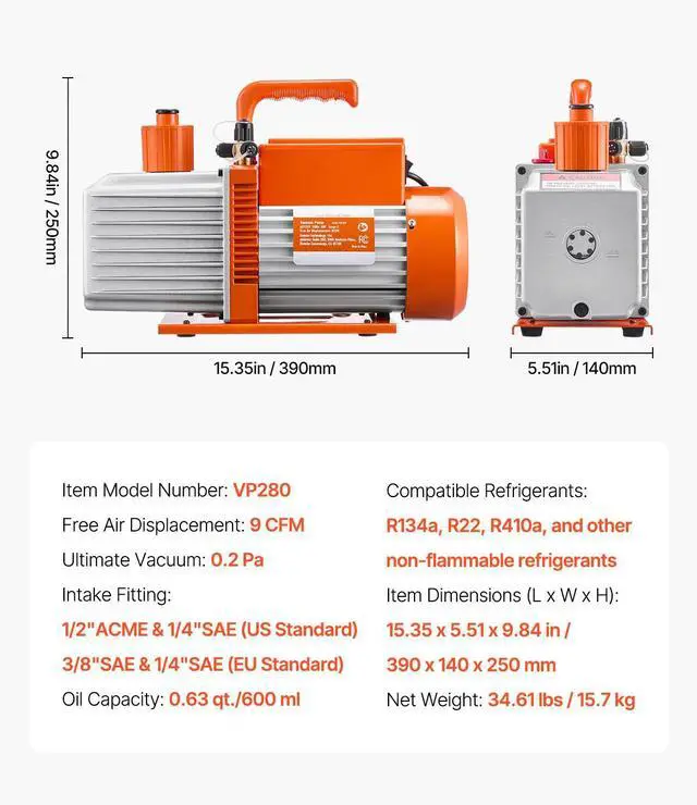 Oil Capacity: 0.63 qt./600 ml,Item Dimensions (L x W x H): 15.35 x 5.51 x 9.84 in / 390 x 140 x 250 mm,Ultimate Vacuum: 0.2 Pa,Item Model Number: VP280,Intake Fitting: 1/2"ACME & 1/4"SAE,Free Air Displacement: 9 CFM,Net Weight: 34.61 lbs / 15.7 kg,Power: 750W,Compatible Refrigerants: R134a, R22, R410a, and other non-flammable refrigerants