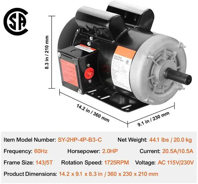 Horsepower: 2.0HP,Voltage: AC 115V/230V,Item Model Number: SY-2HP-4P-B3-C,Frequency: 60Hz,Product Dimensions: 14.2 x 9.1 x 8.3 in / 360 x 230 x 210 mm,Current: 20.5A/10.5A,Net Weight: 44.1 lbs / 20.0 kg,Frame Size: 143/5T,Rotation Speed: 1725RPM