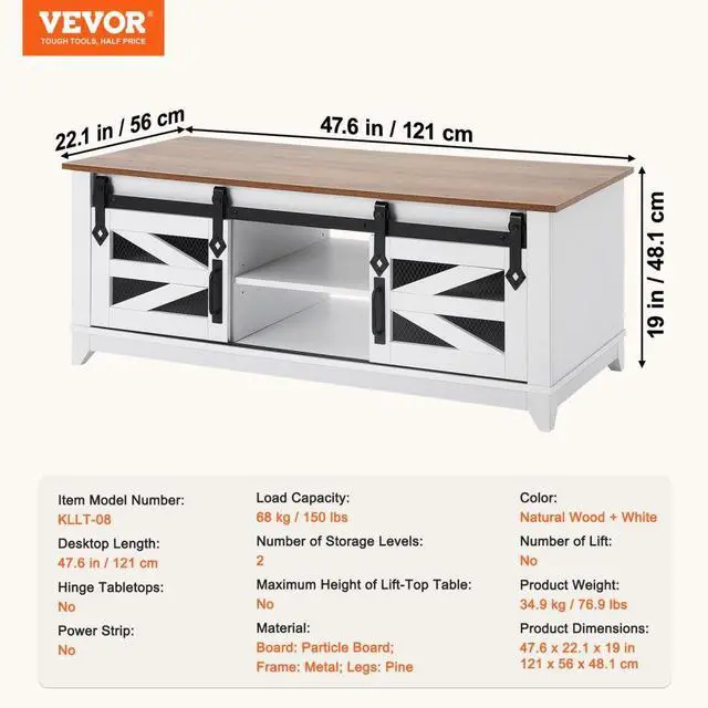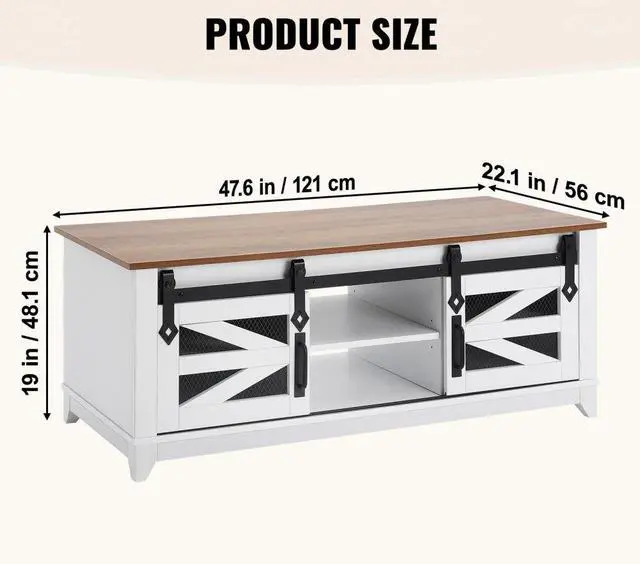 VEVOR 48" Farmhouse Coffee Table, Rectangle Coffee Table with 2 Sliding Barn Doors, 2 Tiers Wooden Rustic Table with Removable Shelves for Living Room, Bedroom, Apartment, or Studio, White & Natural