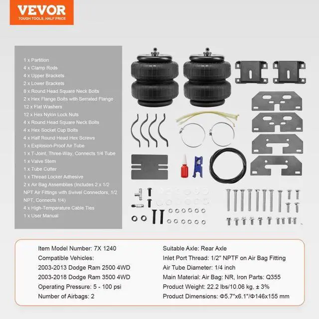 Operating Pressure: 5 - 100 psi,Suitable Axle: Rear Axle,Item Model Number: 7X 1240,Number of Airbags: 2,Product Weight: 22.2 lbs/10.06 kg, ± 3%,Compatible Vehicles: 2003-2013 Dodge Ram 2500 4WD, 2003-2018 Dodge Ram 3500 4WD,Air Tube Diameter: 1/4 inch,Product Dimensions: 5.7"x6.1"/146x155 mm,Inlet Port Thread: 1/2" NPTF on Air Bag Fitting,Main Material: Air Bag: NR, Iron Parts: Q355,Rated Load: 5000 lbs/2267.96 kg