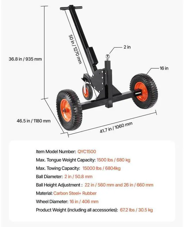 Item Model Number: QYC1500,Product Weight: 67.5 lbs / 30.6 kg,Material: Carbon Steel + Rubber,Wheel Diameter: 15.2 inch / 386.1 mm,Max. Tongue Weight Capacity: 1500 lbs / 680.4 kg,Ball Diameter: 2 inch / 50.8 mm,Ball Height Adjustment: 22 in / 560 mm and 26 in / 660 mm