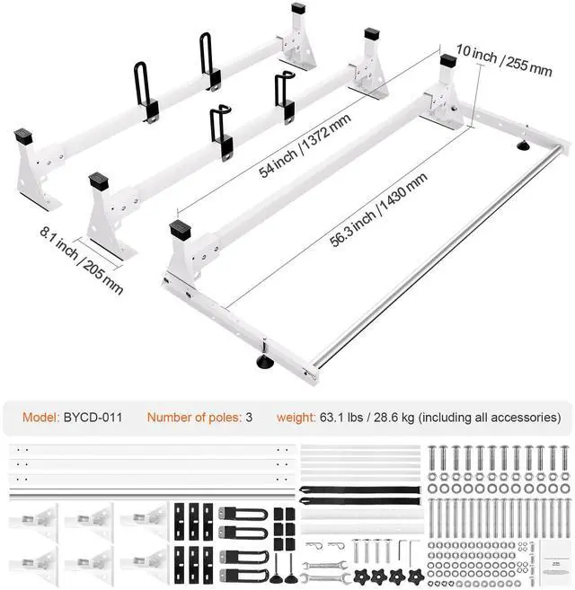 Item Size: 56.3x8.1x10 inch / 1430x205x255 mm,Number of Rods: 3,Item Model Number: BYCD-011,Maximum Load Capacity: 800 lbs,Item Length: 54 inch/1372 mm,Net Weight: 63.1 lbs / 28.6 kg (including all accessories),Main Material: Q235B