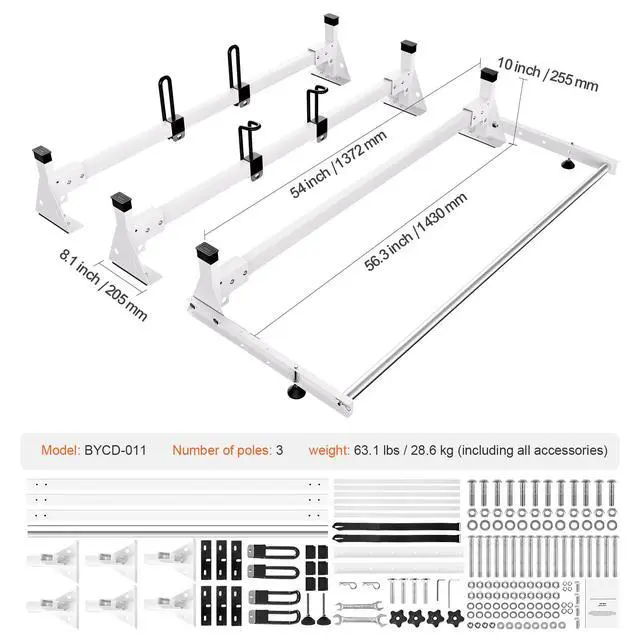 Item Size: 56.3x8.1x10 inch / 1430x205x255 mm,Number of Rods: 3,Item Model Number: BYCD-011,Maximum Load Capacity: 800 lbs,Item Length: 54 inch/1372 mm,Net Weight: 63.1 lbs / 28.6 kg (including all accessories),Main Material: Q235B