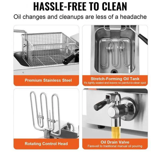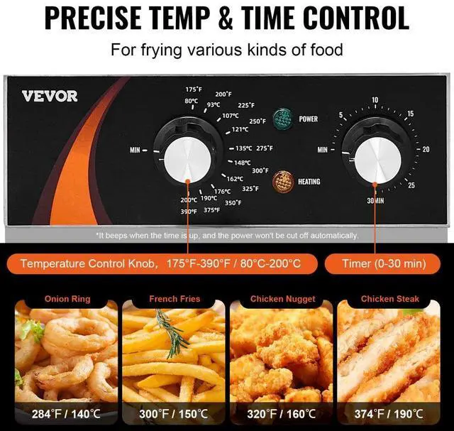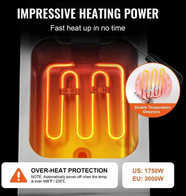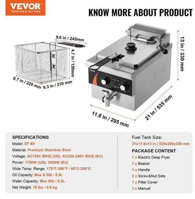 Oil Capacity: Max 6.2Qt / 5.9L,Water Capacity: Max 9Qt / 8.5L,Voltage: AC120V 60HZ,Item Model Number: EF-6V,Material: Premium Stainless Steel,Wide Temp. Range: 175°F-390°F / 80°C-200°C,Net Weight: 19 lbs / 8.6 kg,Power: 1750W