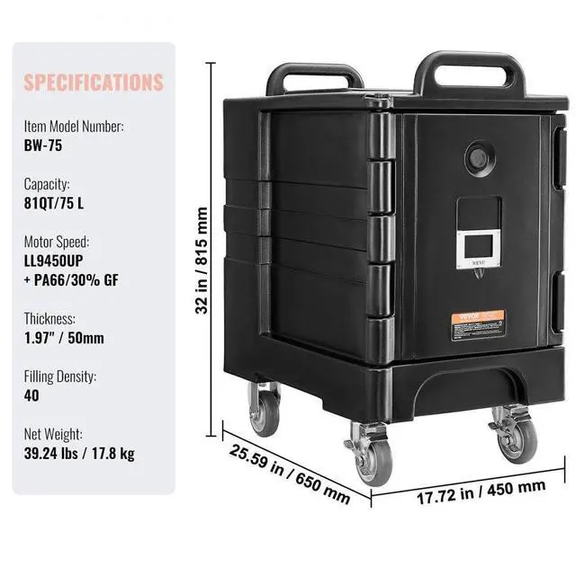 Thickness: 1.97" / 50mm,Capacity: 81QT/75 L,Item Model Number: BW-75,Filling Density: 40,Material: LL9450UP + PA66/30% GF,Product Dimensions (L x W x H): 25.59 x 17.72 x 32 inch / 650 x 450 x 815 mm,Net Weight: 39.24 lbs / 17.8 kg