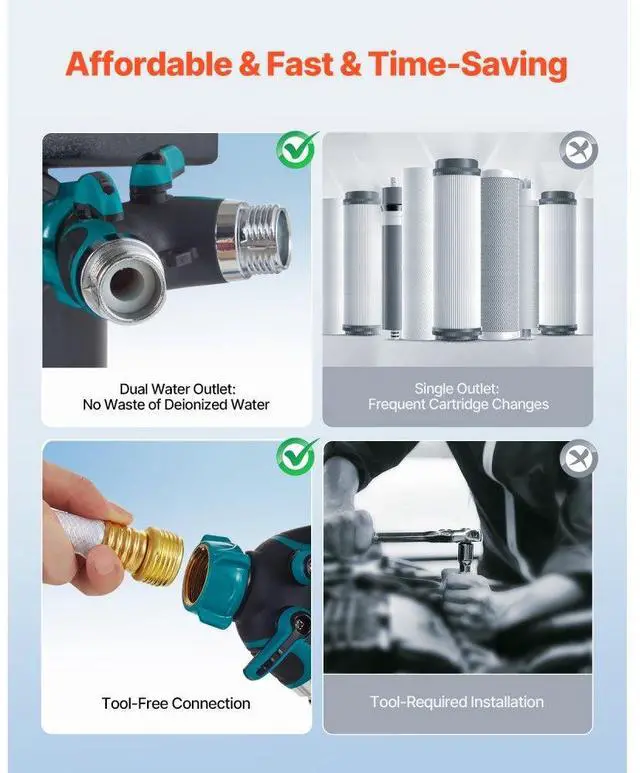 Outlet Mode: Dual Outlet Mode,Inlet Hose Diameter: US Standard GHT 3/4" (Male),Tank Capacity: 4L x 2,Main Materials: PP (Outer Shell),Working Temperature: 4-45°C,Item Model Number: JY-DI-02US6,Rated Purified Water Output: 320 gallons (1211L),Inlet Working Pressure: 0.4-0.6 MPa,Product Dimensions: 16.06" x 7.20" x 25.23" / 408 x 183 x 641 mm,Material Composition: Mixed-Bed Resin,Net Weight: 35.49 lbs / 16.1 kg,Outlet Hose Diameter: US Standard GHT 3/4" (Female)