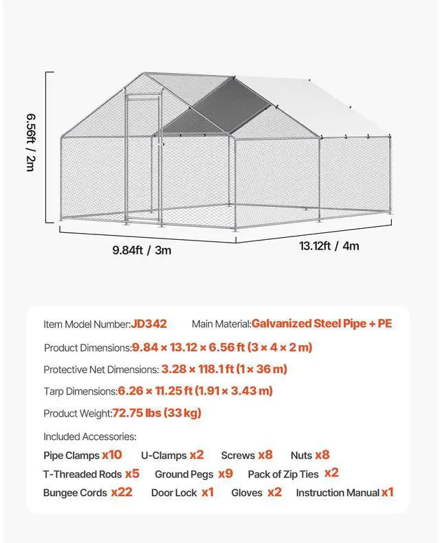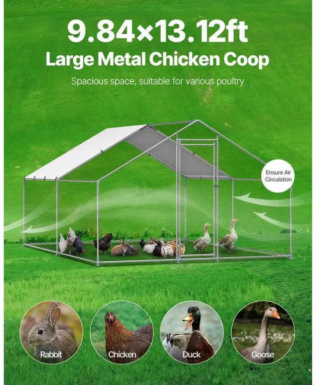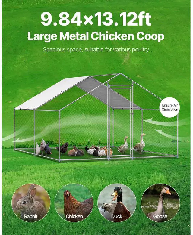 Spacious Living Area: Offering a generous 9.8 x 13.1 x 6.5 ft of space, this metal chicken run features four-sided ventilation, creating a healthy and comfortable environment. The PE-coated canopy provides sun protection, waterproofing, and tear resistance, shielding your poultry from external elements.