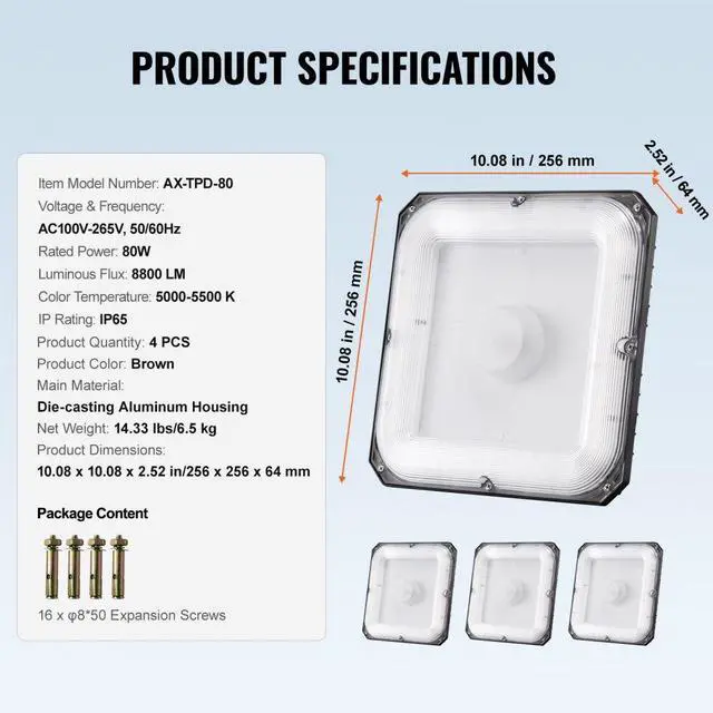 Product Quantity: 4 PCS,Color Temperature 5000-5500 K:,IP Rating: IP65,Product Color: Brown,Item Model Number: AX-TPD-80,Rated Power: 80W,Voltage & Frequency: AC100V-265V, 50/60Hz,Product Dimensions: 10.08 x 10.08 x 2.52 in/256 x 256 x 64 mm,Net Weight: 14.33 lbs/6.5 kg,Main Material: Die-casting Aluminum Housing,Luminous Flux: 8800 LM