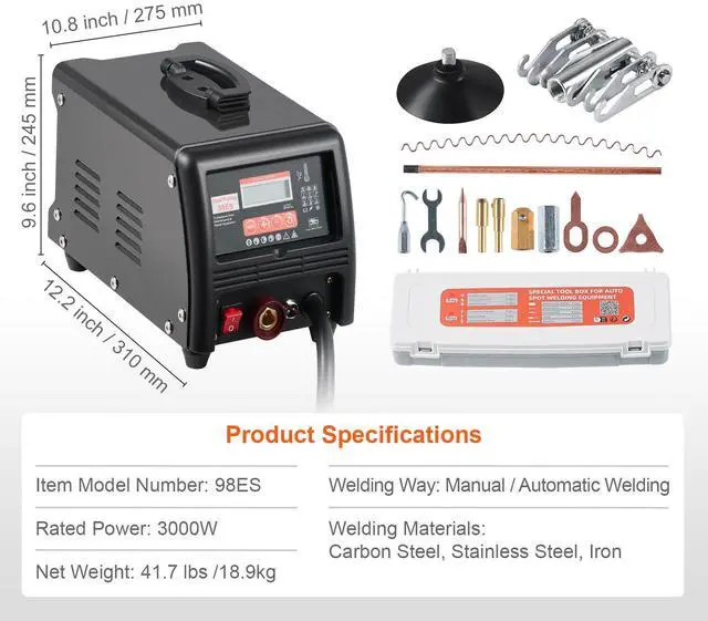 Welding Materials: Carbon Steel, Stainless Steel, Iron,Item Model Number: 98ES,Rated Power: 3000W,Product Dimensions: 13.2 x 7.5 x 10.2 inch / 335 x 190 x 260 mm,Net Weight: 41.7 lbs / 18.9 kg,Welding Way: Manual / Automatic Welding