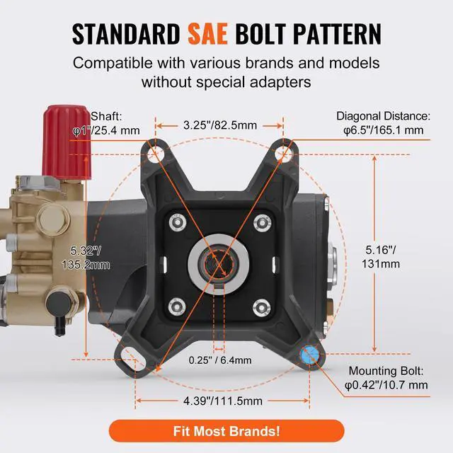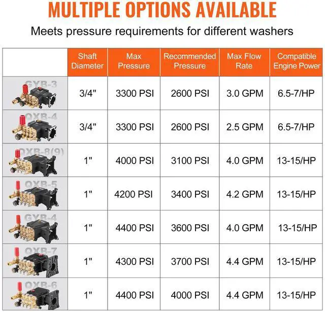 Primary Material: Copper, Aluminum,Inlet Connector: 3/4" NH Garden Hose,Max/Recommended Pressure: 4000/3100 PSI,Compatible Engine Power: 13-15 HP,Item Model Number: QXB-9,Outlet Connector: 3/8" Quick Connect,Shaft Diameter: 1"/25.4 mm,Max Flow Rate: 4.0 GPM,Net Weight: 21.38 lbs/9.7 kg,Engine Orientation: Horizontal