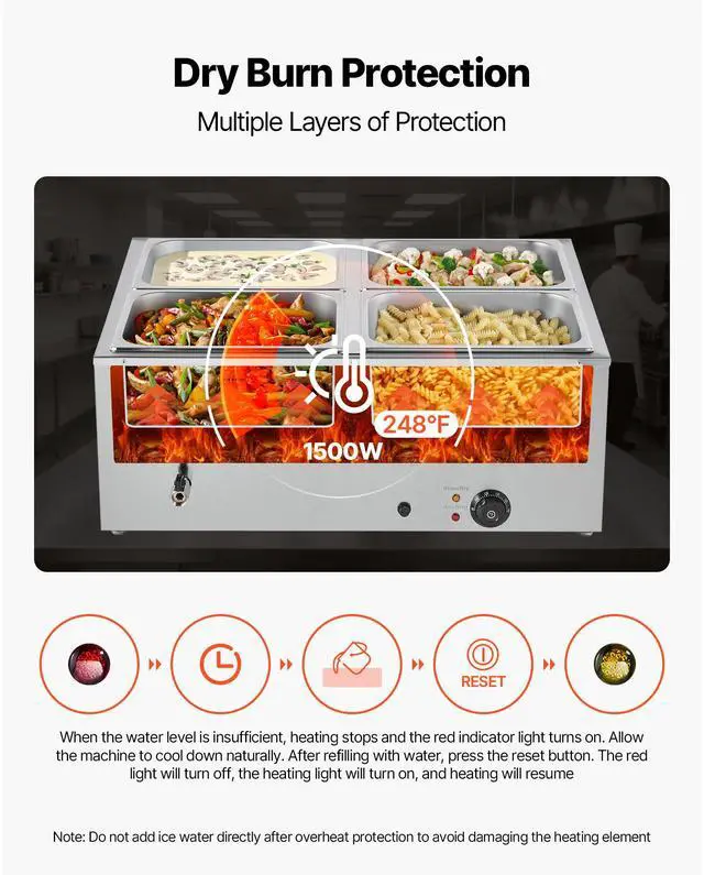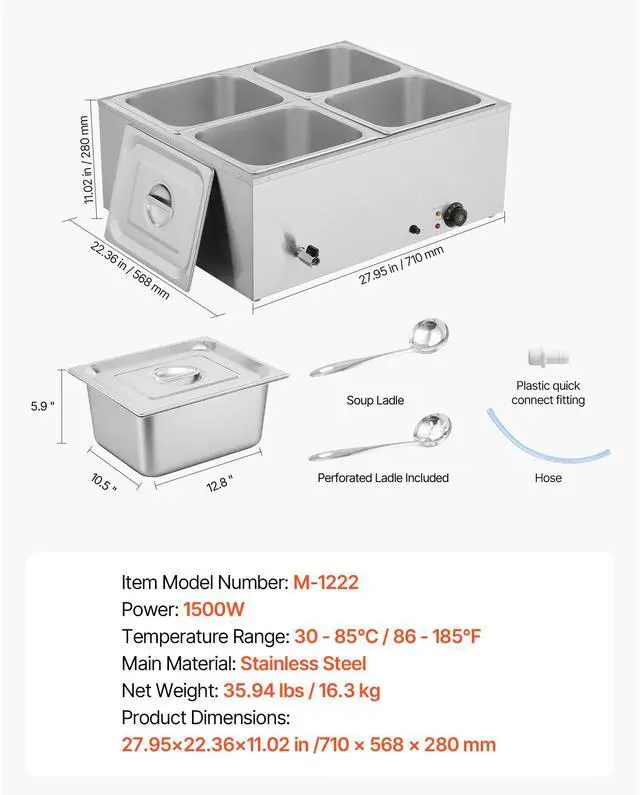Capacity: 4 x 8QT,Item Model Number: HT-6V,Product Weight: 29.5 lbs / 13.4 kg,Temperature Range: 86-185°F / 30-85°C,Power: 1500W,Main Material: Stainless Steel,Product Size: 27.2 x 24.6 x 10.2 inches / 691 x 626 x 260 mm