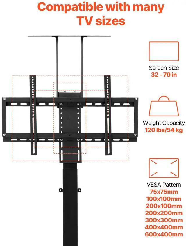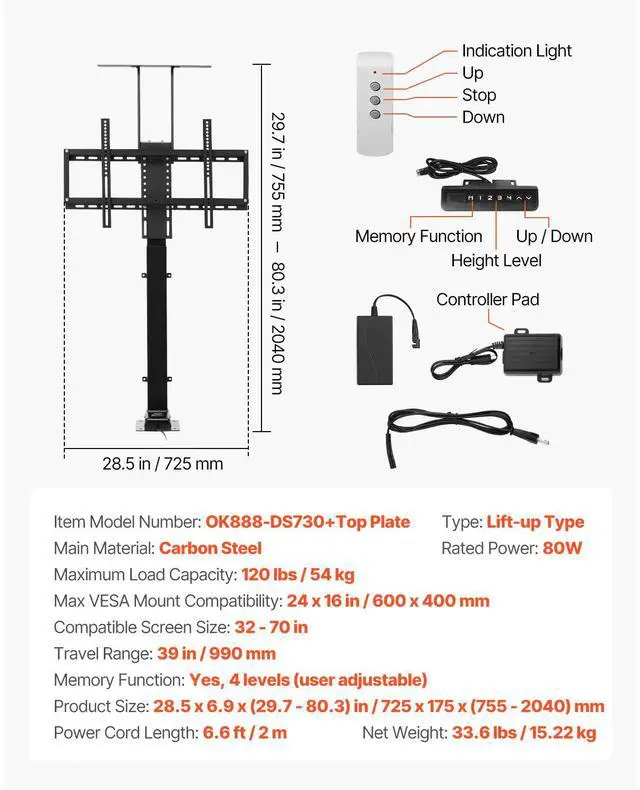 Max VESA Mount Compatibility: 24 x 16 in / 600 x 400 mm,Power Cord Length: 6.6 ft / 2 m,Type: Lift-up Type,Memory Function: Yes, 4 levels (user adjustable),Travel Range: 39 in / 990 mm,Item Model Number: OK888-DS730+Top Plate,Maximum Load Capacity: 120 lbs / 54 kg,Compatible Screen Size: 32 - 70 in,Rated Power: 80W,Net Weight: 33.6 lbs / 15.22 kg,Main Material: Carbon Steel,Product Size: 28.5 x 6.9 x (29.7 - 80.3) in / 725 x 175 x (755 - 2040) mm