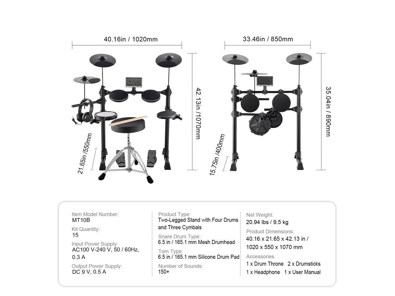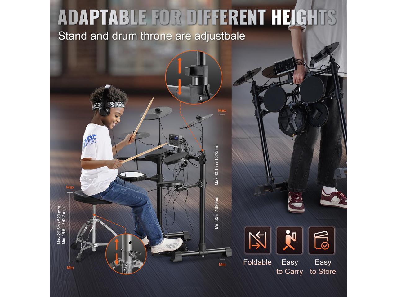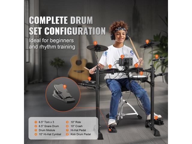 - Complete Drum Kit: This electric drum set includes four 6.5" drums and three 10" cymbals, giving you an entire striking area. The drum module, sticks, and pedals are included, plus headphones and an adjustable throne. It's ideal for beginners and rhythm training!