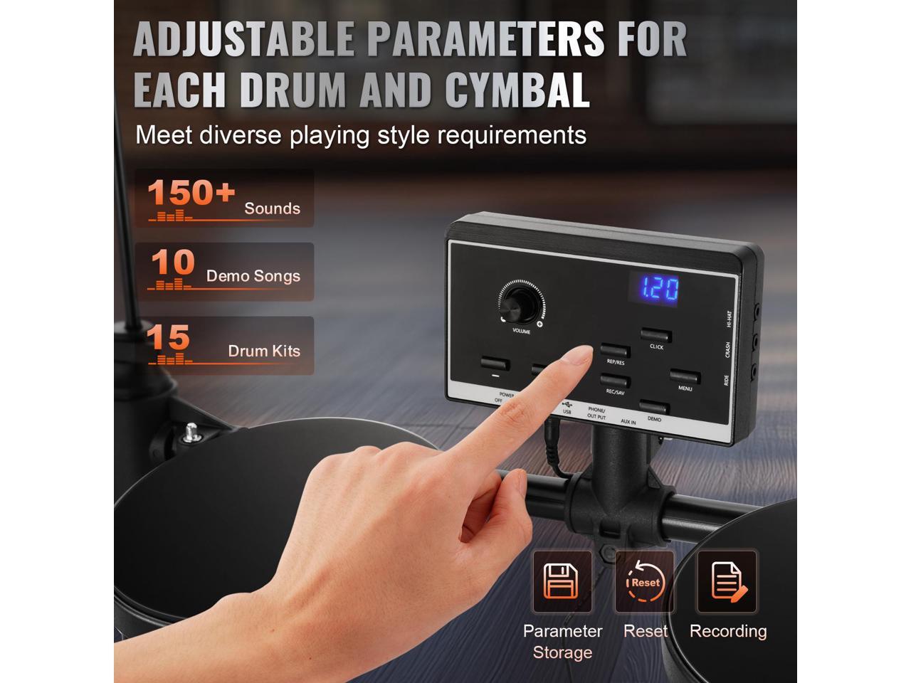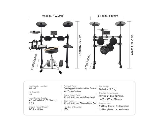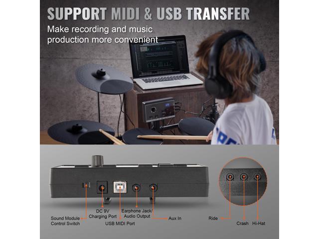 - Easy MIDI Connectivity: This electric drum kit can connect to multimedia with audio output / input (AUX IN), headphones interface (PHONE / OUT), crash / ride / hi-hat inputs, DC 9V charging port, and USB MIDI transmission. Enjoy added features like parameter storage, reset, and recording help.