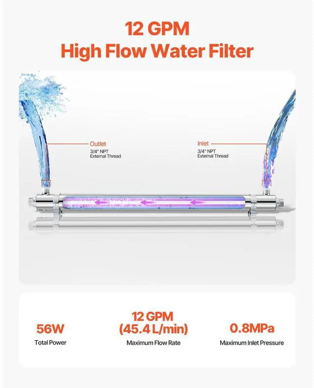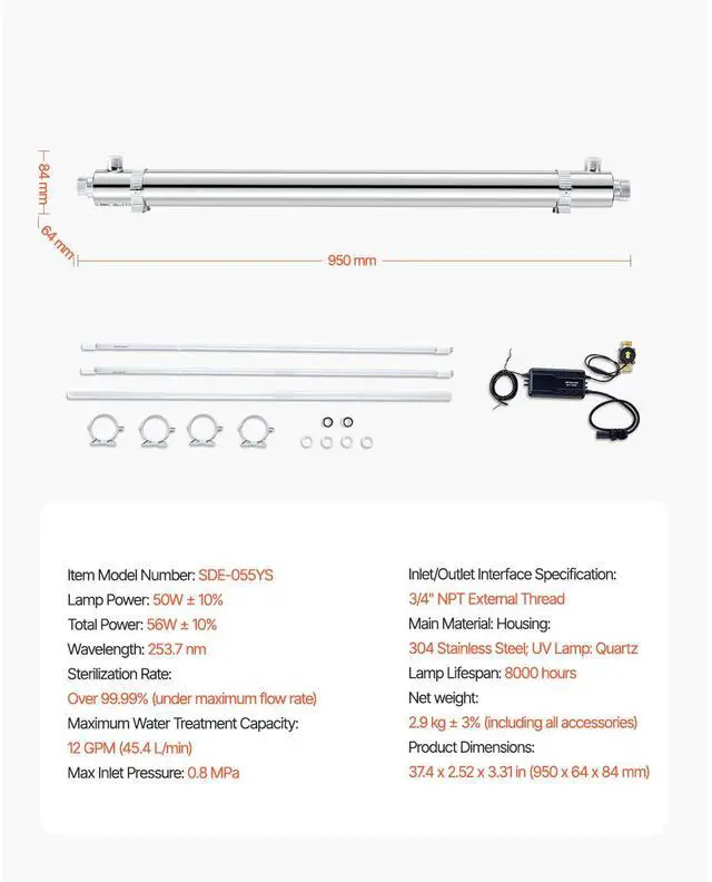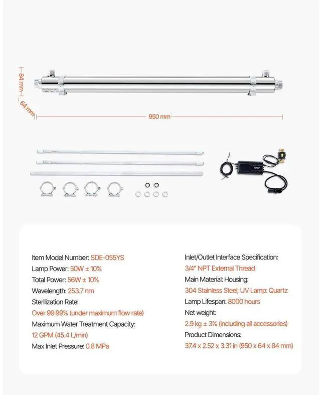Lamp Power: 50W ±10%,Maximum Water Treatment Capacity: 12 GPM (45.4 L/min),Total Power: 56W ±10%,Item Model Number: SDE-055YS,Net weight: 6.39 lbs/2.9 kg (including all accessories),Max Inlet Pressure: 0.8MPa,Product Dimensions: 37.4 x 2.52 x 3.31 in/950 x 64 x 84 mm,Wavelength: 253.7nm,Sterilization Rate: Over 99.99% (under maximum flow rate),Main Material: Housing: 304 Stainless Steel; UV Lamp: Quartz,Lamp Lifespan: 8000 hours,Inlet/Outlet Interface Specification: 3/4" NPT External Thread