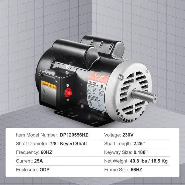 Shaft Length: 2.25",SF: 1.0,Voltage: 230V,Item Model Number: DP120556HZ,Frequency: 60HZ,Shaft Diameter: 7/8" Keyed Shaft,Enclosure: ODP,Current: 25A,Net Weight: 40.8 lbs / 18.5 Kg,Keyway Size: 0.188",Rotation Speed: 3450rpm,Frame Size: 56HZ