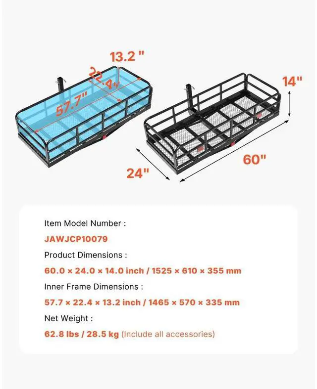 Inner Frame Dimensions: 57.7 x 22.4 x 13.2 in / 1465 x 570 x 335 mm,Item Model Number: JAWJCP10079,Product Dimensions: 60.0 x 24.0 x 14.0 in / 1525 x 610 x 355 mm,Net Weight: 62.8 lbs / 28.5 kg (Include all accessories)