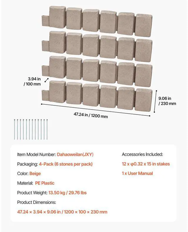 Color: Beige,Item Model Number: DahaoweilanJXY,Packaging: 4-Pack (6 stones per pack),Product Weight: 13.80 kg / 30.42 lbs,Material: PE Plastic,Product Dimensions: 1200 x 100 x 230 mm/ 47.24 × 3.94 × 9.06 inch