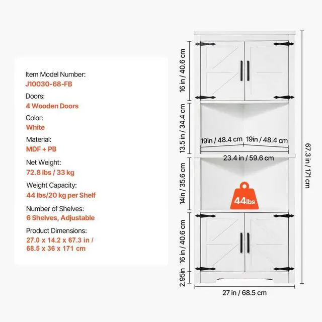 Number of Shelves: 6 Shelves, Adjustable,Weight Capacity: 44 lbs/20 kg per Shelf,Doors: 4 Wooden Doors,Color: White,Item Model Number: J10030-68-FB,Material: MDF + PB,Product Dimensions: 27.0 x 14.2 x 67.3 in / 685 x 360 x 1710 mm,Net Weight: 72.8 lbs / 33 kg