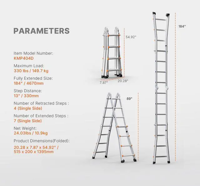 Number of Retracted Steps (Single Side): 4,Number of Extended Steps (Single Side): 7,Maximum Load: 330 lbs / 149.7 kg,Fully Extended Size: 184" / 4670 mm,Step Distance: 13" / 330 mm,Item Model Number: KMP404D,Product Dimensions (Folded): 20.28 x 7.87 x 54.92" / 515 x 200 x 1395 mm,Net Weight: 24.03 lbs / 10.9 kg