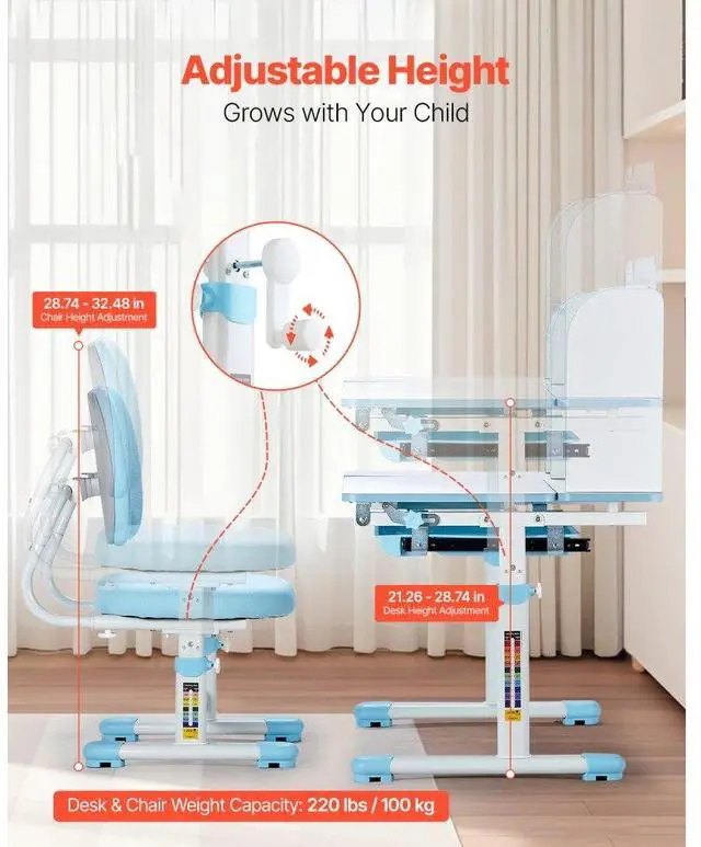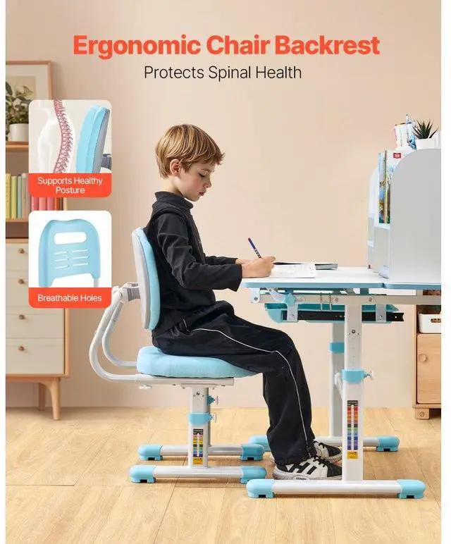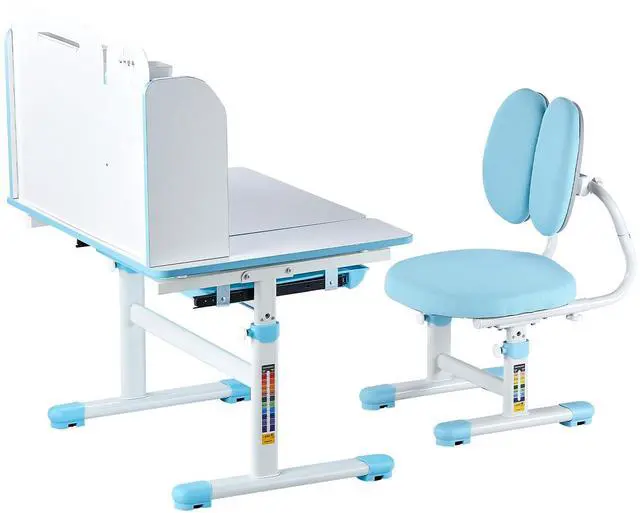 Kids Study Chair and Desk with Bookshelf & Drawer Height Adjustable Blue