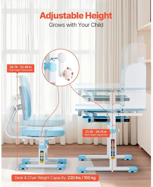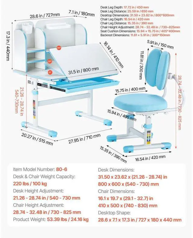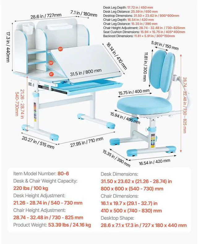 Desk Height Adjustment: 21.26 - 28.74 in / 540 - 730 mm,Chair Height Adjustment: 28.74 - 32.48 in / 730 - 825 mm,Desktop Shape: 28.6 x 7.1 x 17.3 in / 727 x 180 x 440 mm,Chair Dimensions: 16.1 x 19.7 x (29.1 - 32.7) in / 410 x 500 x (740 - 830) mm,Item Model Number: 80-6,Product Weight: 53.39 lbs / 24.16 kg,Desk Dimensions: 31.50 x 23.62 x (21.26 - 28.74) in / 800 x 600 x (540 - 730) mm,Desk & Chair Weight Capacity: 220 lbs / 100 kg