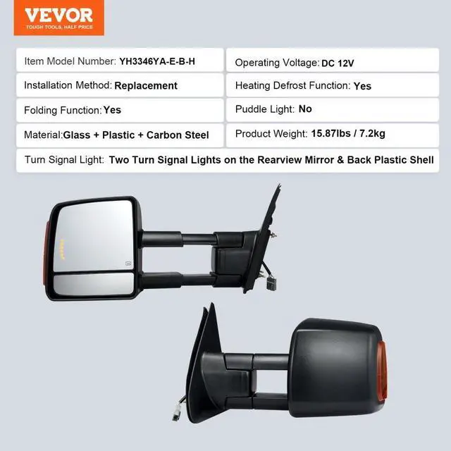 Installation Method: Replacement,Color: Black,Item Model Number: YH3346YA-E-B-H,Compatible Brands and Models: 2007-2016 Toyota Tundra,Product Weight: 15.87 lbs/7.2 kg,Material: Glass + Plastic + Carbon Steel,Product Size: 18.50 x 10.24 x 7.87 in/470 x 260 x 200 mm