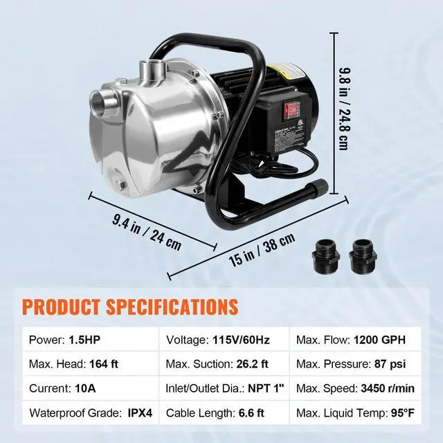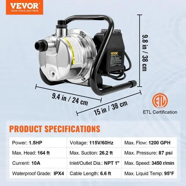Waterproof Grade: IPX4,Material: Stainless Steel + Cast Aluminum,Max Flow Rate: 1200 GPH (4.5 m³/h),Insulation Class: F,Certification: ETL,Max Liquid Temp: 95/35,Product Size (L x W x H): 15 x 9.4 x 9.8 in/38 x 24 x 24.8 cm,Max Suction Height: 26.2 ft/8 m,Voltage: 115V/60Hz,Max Head Lift: 164 ft/50 m,Model: XKJ-1105S,Max Pressure: 87 psi/6 bar,Inlet/Outlet Diameter: NPT 1"/2.5 cm,Product Weight: 24.7 lbs/11.2 kg,Cable Length: 6.6 ft/2 m,Current: 10A,Handle Material: Iron,Power: 1.5HP/1100W,Max Speed: 3450 RPM