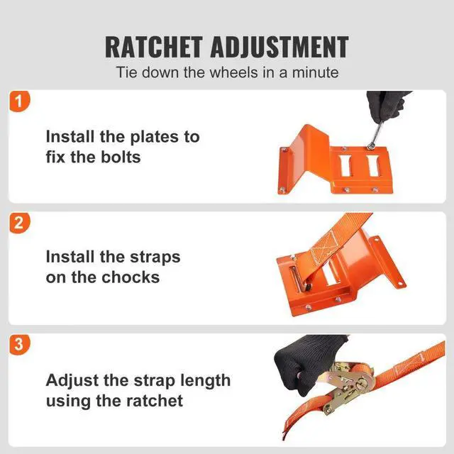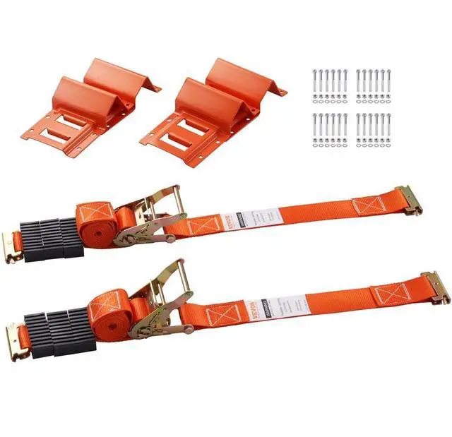 VEVOR Wheel Chock Tie Down Kit, 2" x 96" Tie Down Strap Kit, Heavy Duty Trailer Tie Down System for 10"-23" Wheels, ATV, UTV, Trailer, Mower, Wheel Chock & Tie-Down Accessories, 4-Pack