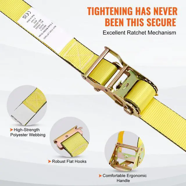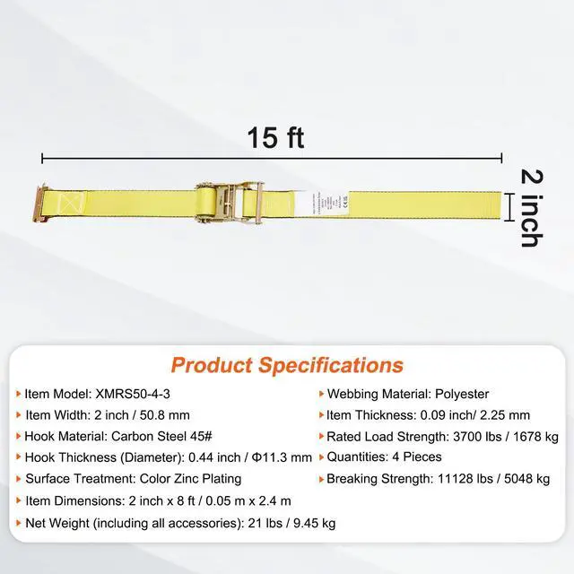 Rated Load Strength: 1460 lbs / 662.2 kg,Item Model: XMES50-8,Item Thickness: 0.05 inch/ 1.2 mm,Hook Material: Carbon Steel 40Mn,Net Weight (including all accessories): 15.4 lbs / 7 kg,Hook Thickness: 0.1 inch / 2.5 mm,Breaking Strength: 4400 lbs / 1995.8 kg,Surface Treatment: Color Zinc Plating,Item Dimensions: 2 inch x 15 ft / 0.05 m x 4.6 m,Quantities: 8 Pieces,Item Width: 2 inch / 50.8 mm,Webbing Material: Polyester