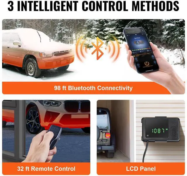 Our upgraded diesel heater now has Bluetooth control for greater convenience. Download the app to preheat your heater from up to 98 ft/30 m away, or use the included 32 ft/10 m remote control and LCD.