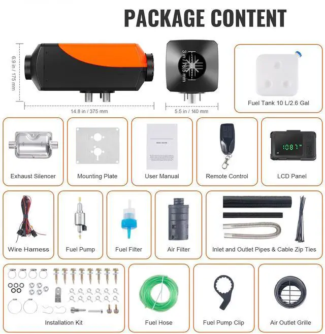 BTU: 161-215ft²/15-20 m²,Operating Consumption: 12V/3A,Fuel Tank Volume: 10 L/2.6 Gal,Control Method: LCD+Remote Control+Bluetooth APP,Adjustable Temperature Range: 46-96.8/8-36,Product Size: 14.8×5.5×6.9 inch/375×140×175 mm,Fuel Consumption: 0.16-0.52 L/H,Working Temperature: -104-104/-40-40,Item Model Number: XMZ-D2,Applicable Altitude: Below 5500 m/18045 ft,Air Outlet Pipe Inner Diameter: 3 in/76.5 mm,Heating Power: 5 KW,Net Weight: 13.1 lbs/5.95 kg