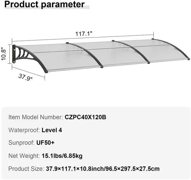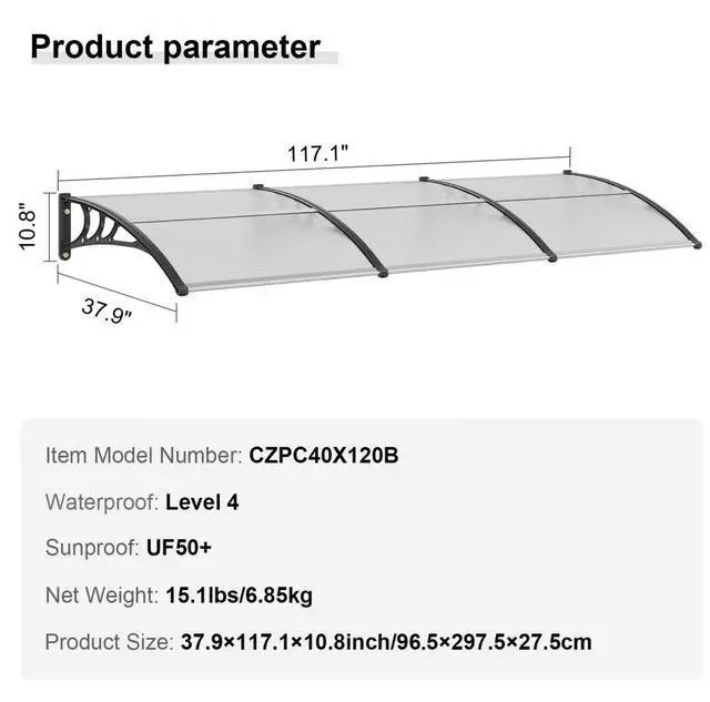 Waterproof: Level 4,Color: Transparent Sheet/Black Bracket/ Silver Connector,Sunproof: UF50+,Item Model Number: CZPC40X120T,Material: PC Sheet + ABS Bracket + Aluminum Connector,Net Weight: 15 lbs / 6.85 kg,Product Size: 38" x 117" / 965 x 2975 mm