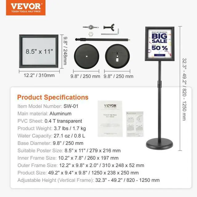 Outer Frame Size: 12.2" x 9.8" x 2.0" / 310 x 248 x 52 mm,Water Capacity: 27.1 oz / 0.8 L,Base Diameter: 9.8" / 250 mm,Suitable Poster Size: 8.5" x 11" / 279 x 216 mm,Inner Frame Size: 10.2" x 7.8" / 260 x 197 mm,Item Model Number: SW-01,Product Weight: 3.7 lbs / 1.7 kg,PVC Sheet: 0.4 T transparent,Adjustable Height (Vertical Frame): 32.3" - 49.2" / 820 - 1250 mm,Main material: Aluminum,Product Size: 49.2" x 9.4" x 9.8" / 1250 x 238 x 250 mm