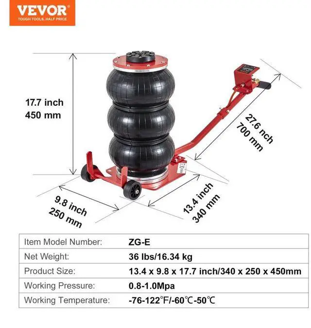 Lifting Height without Load: 5.5-17.7 inch/140 mm-450 mm,Working Pressure: 0.8-1.0Mpa,Normal Pressure Range: 8 kg/cm²,Working Temperature: -76-122/-60-50,Item Model Number: ZG-E,Net Weight: 36 lbs/16.34 kg,Product Size: 13.4 x 9.8 x 17.7 inch/340 x 250 x 450 mm