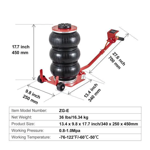Lifting Height without Load: 5.5-17.7 inch/140 mm-450 mm,Working Pressure: 0.8-1.0Mpa,Normal Pressure Range: 8 kg/cm²,Working Temperature: -76-122/-60-50,Item Model Number: ZG-E,Net Weight: 36 lbs/16.34 kg,Product Size: 13.4 x 9.8 x 17.7 inch/340 x 250 x 450 mm