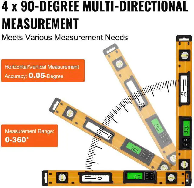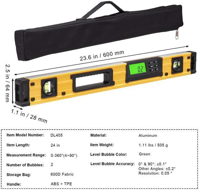 Level Bubble Color: Green,Item Dimensions (L x W x H): 23.62 x 1.1 x 2.52 inch / 600 x 28 x 64 mm,Level Bubble Accuracy: 0.5 mm/M, 0.0005 inch/ft,Item Model Number: DL405,Material: Aluminum Alloy,Item Length: 24 inch,Handle Material: ABS + TPE,Item Weight: 1.11 lbs / 0.5 kg,Measurement Range: 0-360 Degree(4 x 90 Degree),Number of Bubbles: 3
