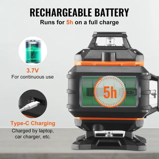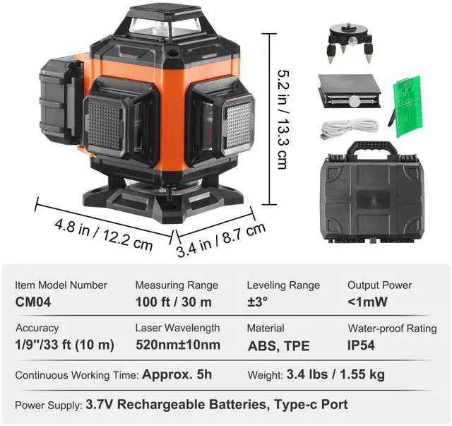 Accuracy: 1/9''/33 ft (10 m),Waterproof Rating: IP54,Output Power: <1mW,Measuring Range: 100 ft / 30 m,Item Model Number: CM04,Leveling Range: ±3°,Material: ABS, TPE,Laser Wavelength: 520 nm ± 10 nm,Continuous Working Time: Approx. 5 h,Item Weight: 3.4 lbs / 1.55 kg,Power Supply: 3.7V Rechargeable Batteries, Type-c Port